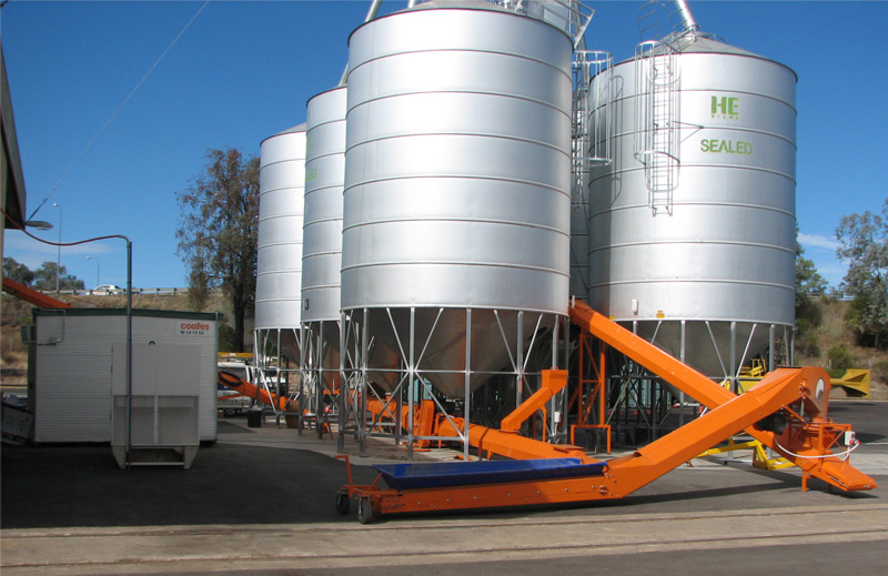 - ‘In-Line’ or ‘cluster’ silo complex is used in conjunction with high performance Aust-Mech Conveyors, resulting in a simple, rugged and cost effective storage and handling solution.